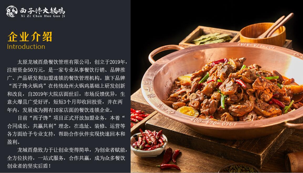 太原龍城酉鼎餐飲管理有限公司,創立于2019年, 注冊資金50萬元,是一家專業從事餐飲行銷、品牌推廣、產品研發和加盟連鎖的餐飲管理機構。旗下品牌“西子饞火鍋雞”在傳統滄州火鍋雞基礎上研發創新和改良,自2019年大院店面世后,市場反饋優異,生意火爆且廣受好評,短短3個月即收回投資,并在兩年內,發展成為擁有10家店面的餐飲連鎖企業。