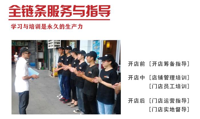 五,培訓支持:免費對加盟店進行理論和實操培訓,著重對管理人員和技術人員進行考核評估。